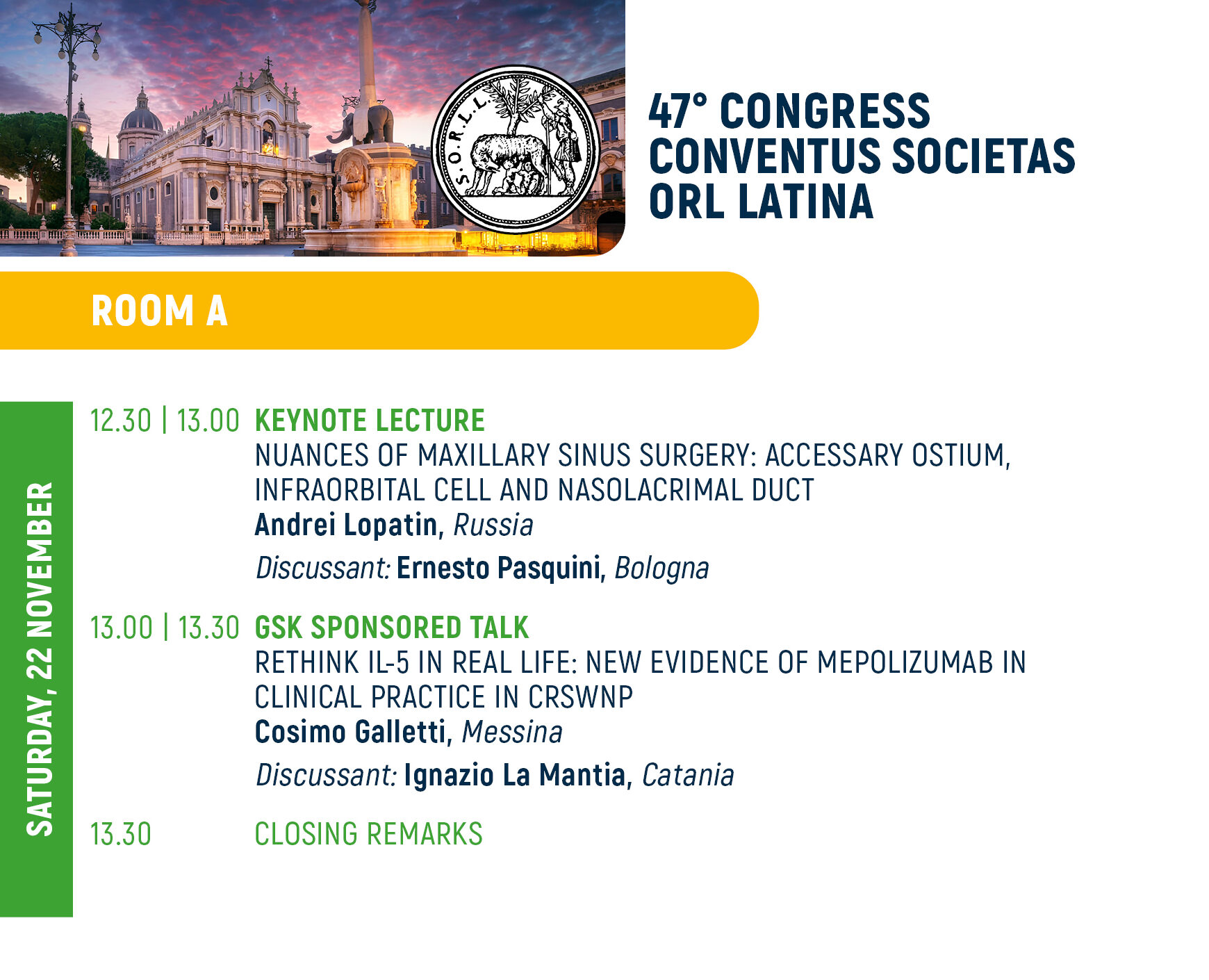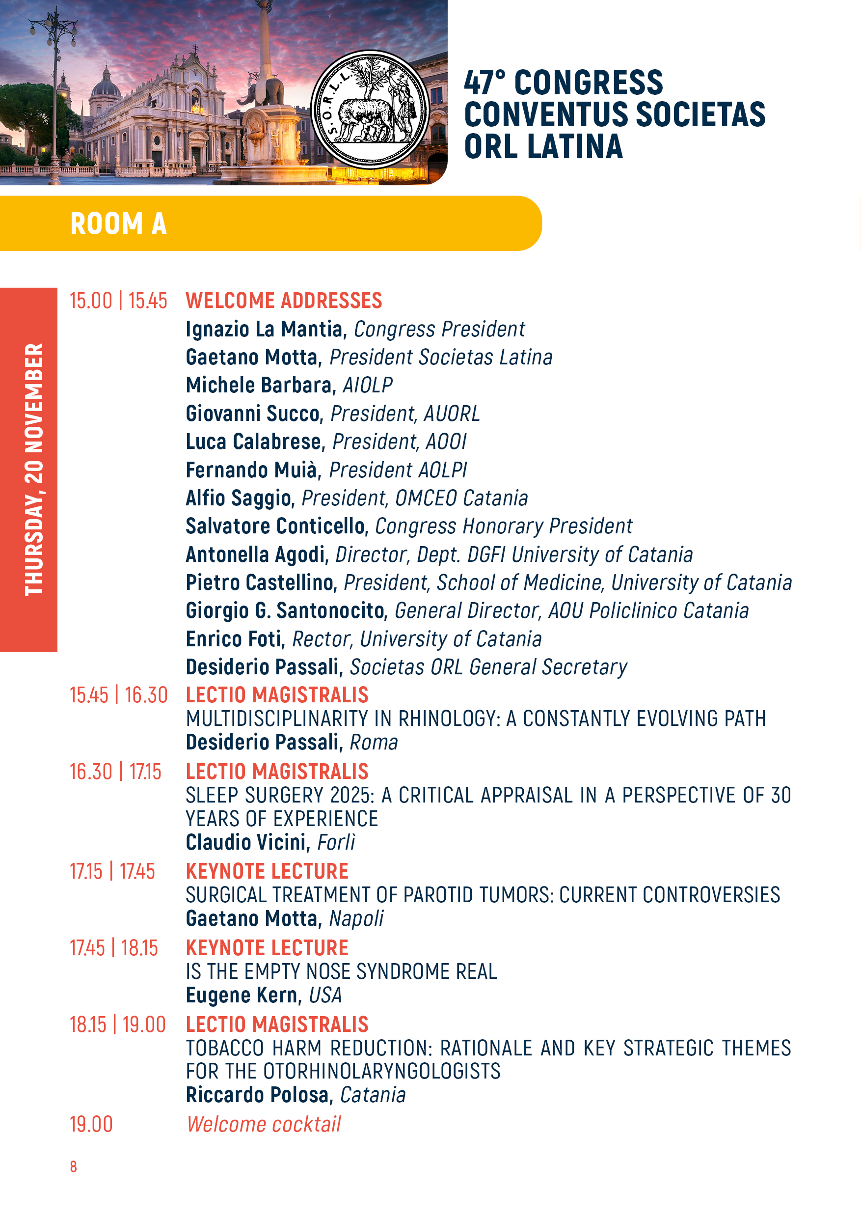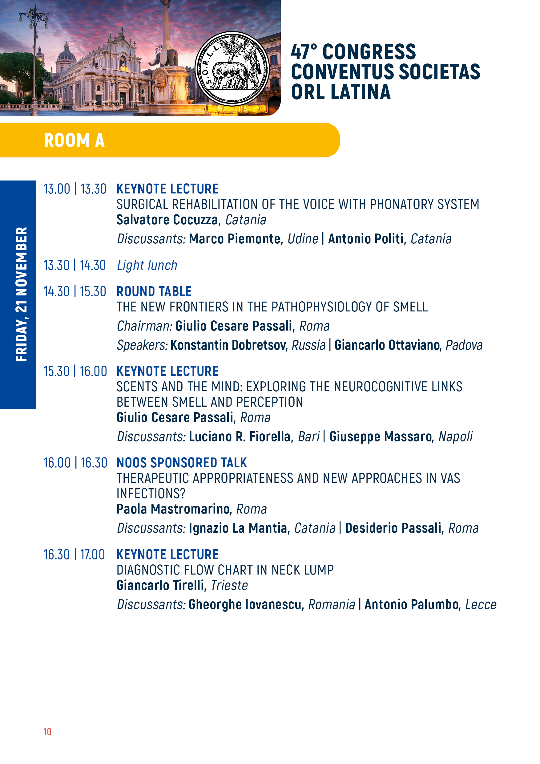 it is not easy for me to describe to you the feelings that I have felt, and continue to feel, since when on the occasion of the Conventus of Naples, Prof. Passali on behalf of the Executive Board informed me that I would have the honor of organizing the 47° Congress “Conventus Societas ORL Latina”.