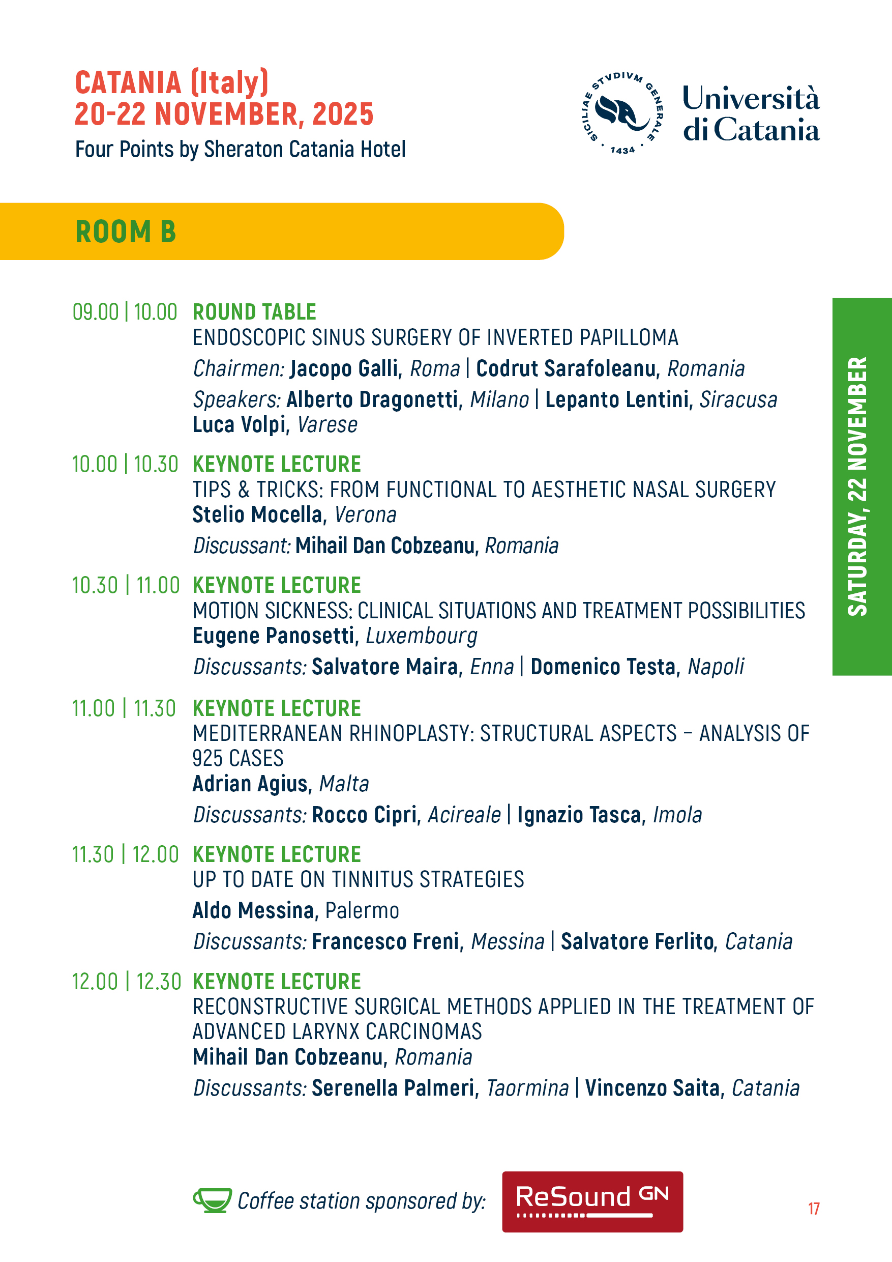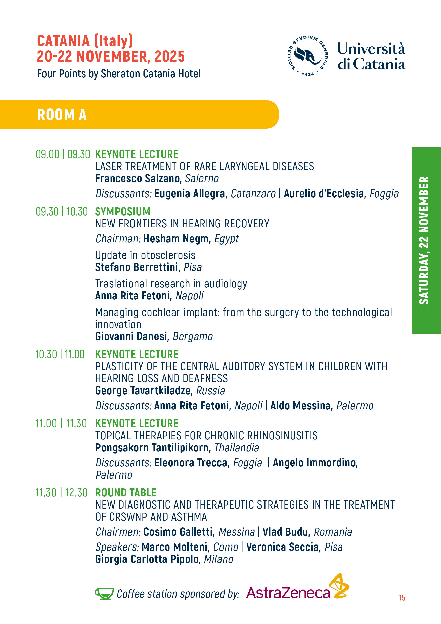 I am, of course, setting up a scientific program that will cover from every angle the most interesting developments regarding the various pathologies that affect the otorhinolaryngological district, placing particular emphasis on the most modern therapeutic approaches: medical, surgical, and rehabilitative, the result of most interesting researches and technological progresses.